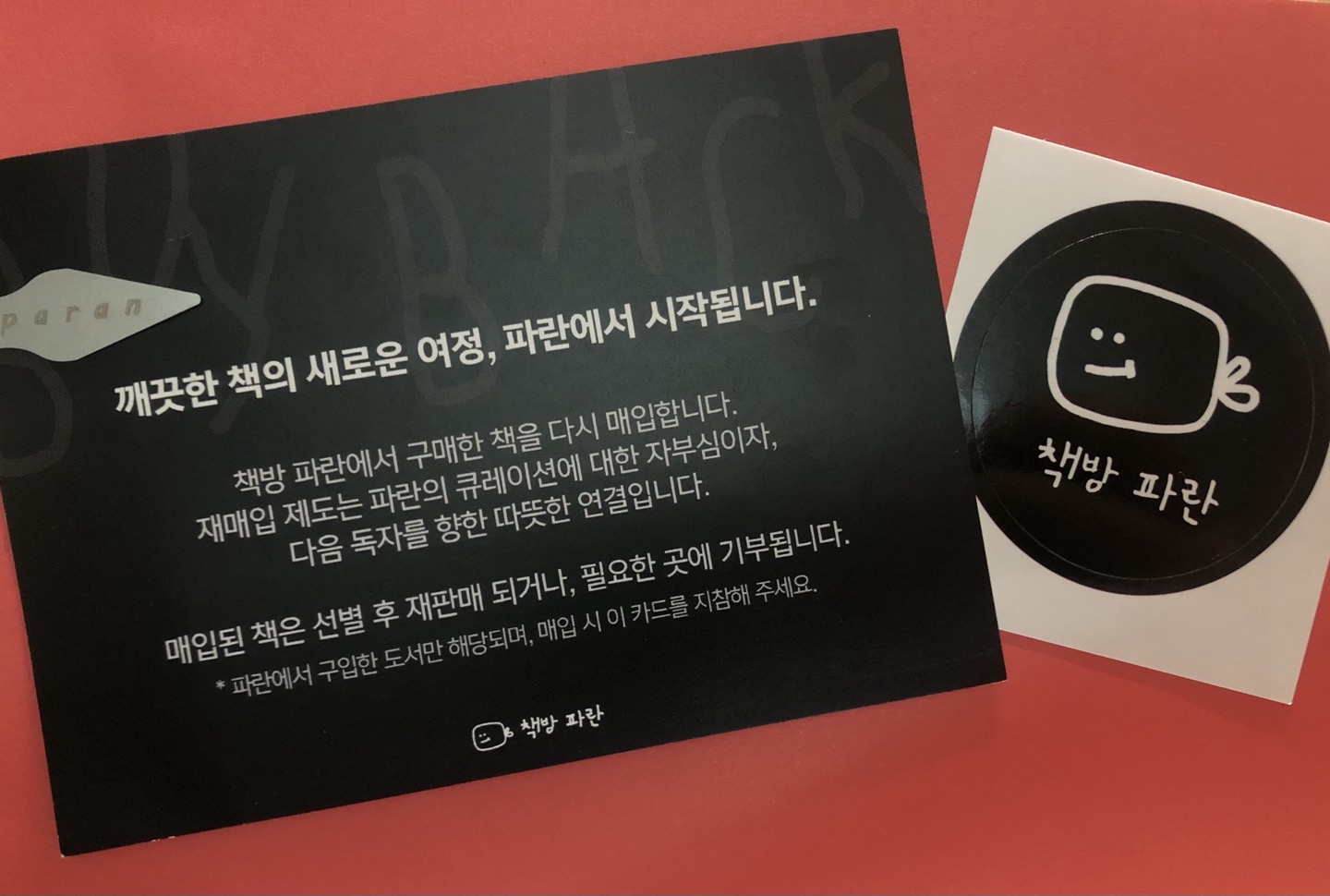 <책방 파란>은 ‘재매입 제도’를 운영하고 있는데, 책을 구매하면 이 카드를 함께 쥐여줍니다. 파란에서 구입한 도서들에 한해 다시 매입한다는 안내 문구가 적힌 카드로, 잘 보관하고 있다가 매입 시 같이 가져가면 된다고 해요. 책방지기님은 ‘시간이 지난 이야기들이 다음 주인을 맞이하는 그림을 위해’ 이 제도를 시작했다고 합니다. 고심하여 채택된 책들이 다 읽히고 난 후, 다른 사람과 좋은 이야기를 같이 나누고 싶다는 마음을 담고 이곳에 다시 들어오게 되는 것이죠. 독자 간의 또 다른 연결이 이루어지는 이곳, 뭔가 바다 같지 않나요?